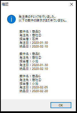 アプリケーションファイルをダブルクリックして動かすと、抜き出した案件の一覧がメッセージボックスとして画面に表示されます。
