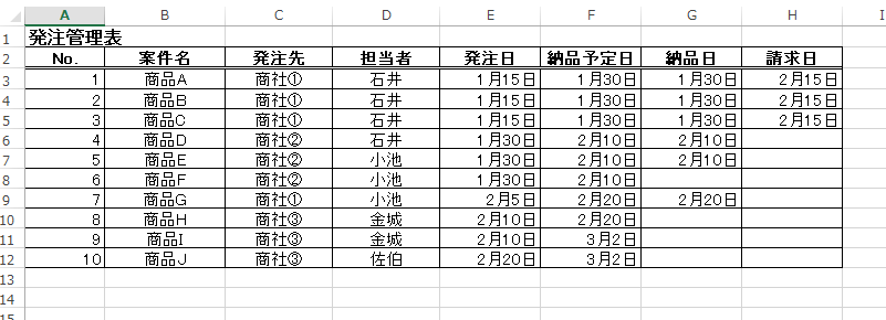 今回は具体例として、エクセルで作った下の画像のような発注管理表ファイルの中から、納品されているけどまだ請求が来ていない案件を調べてテキストファイルに保存するスクリプトを作ります。